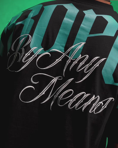 By Any Means embroidery overlaying the rear print
